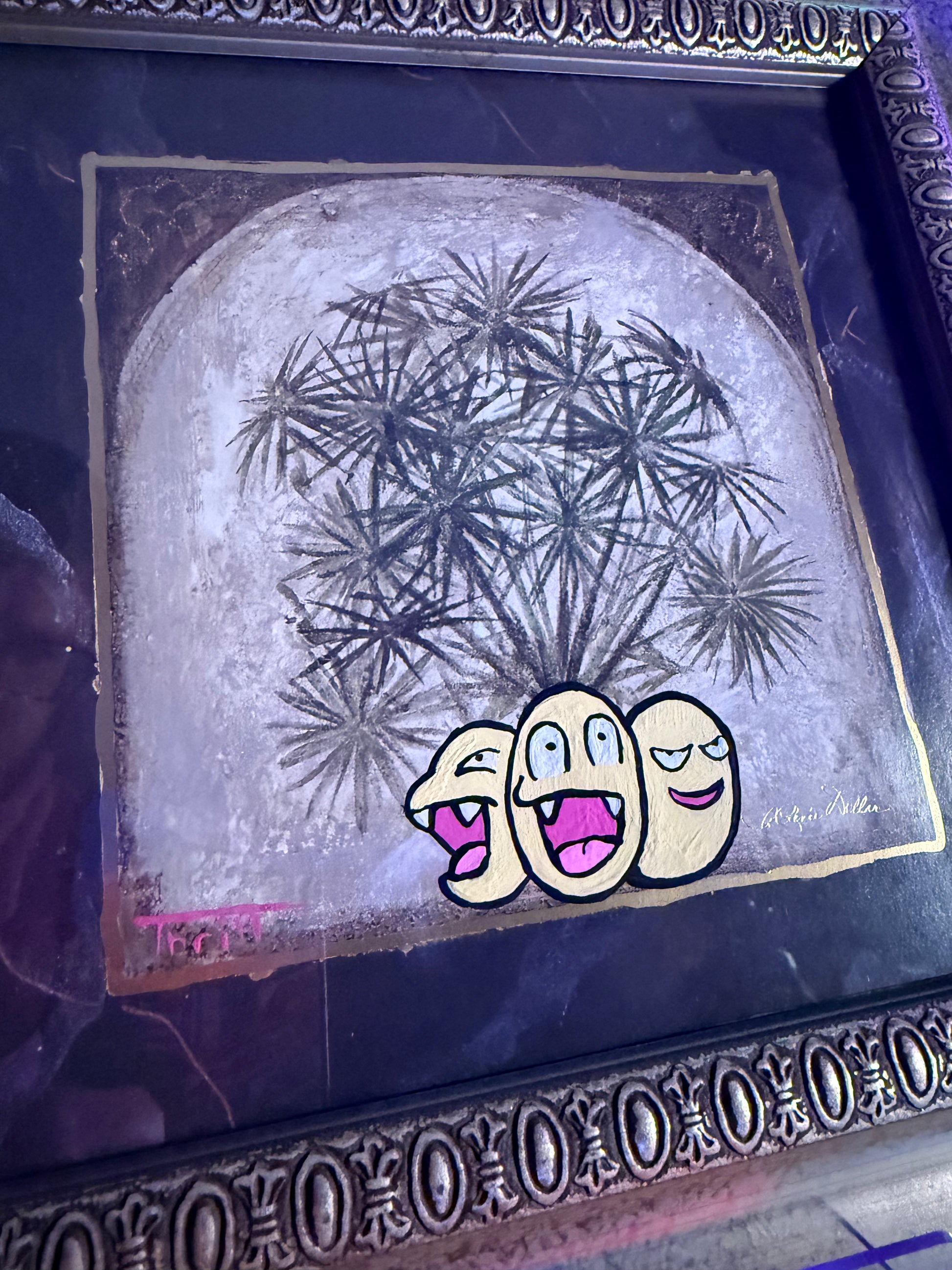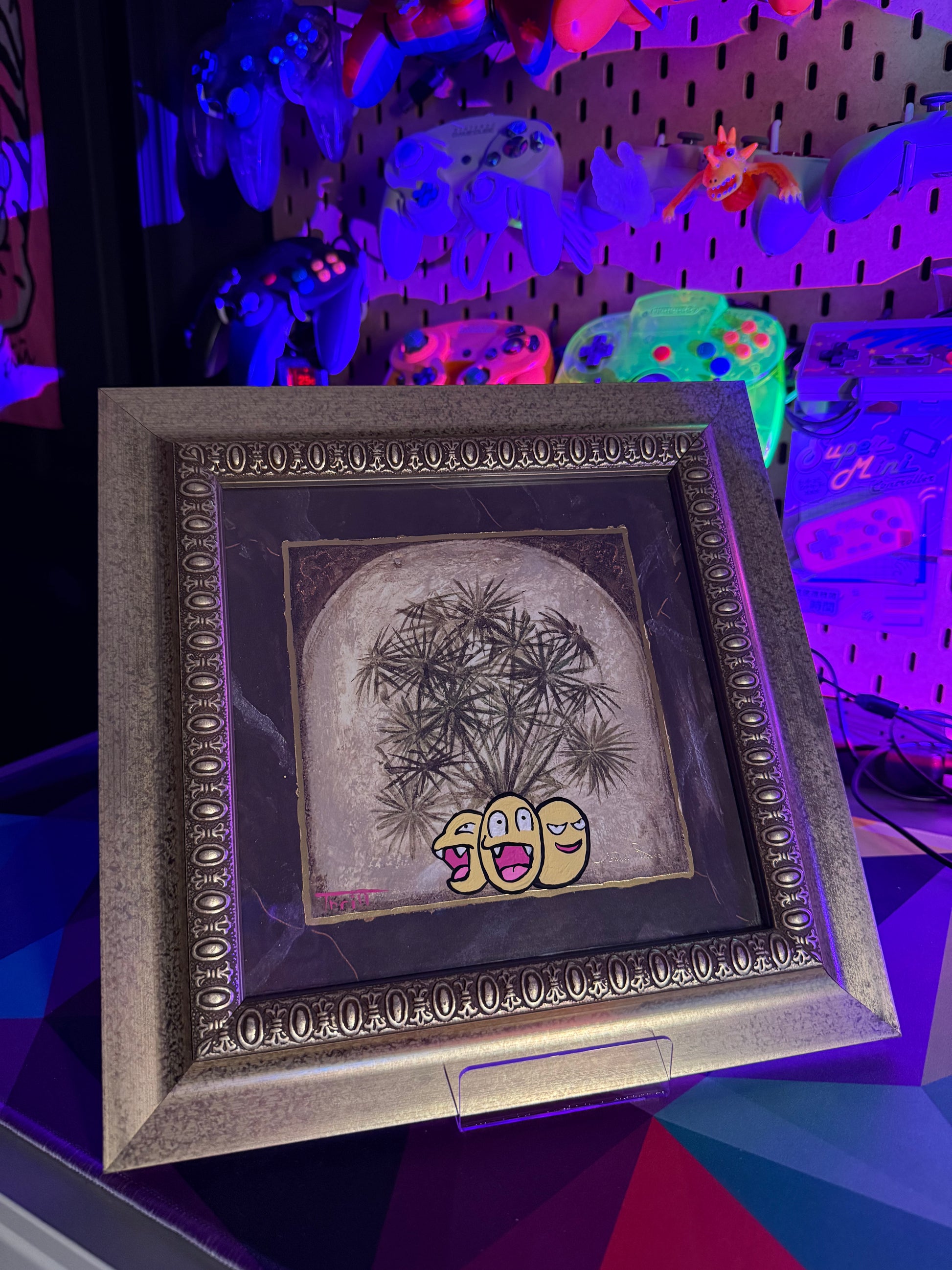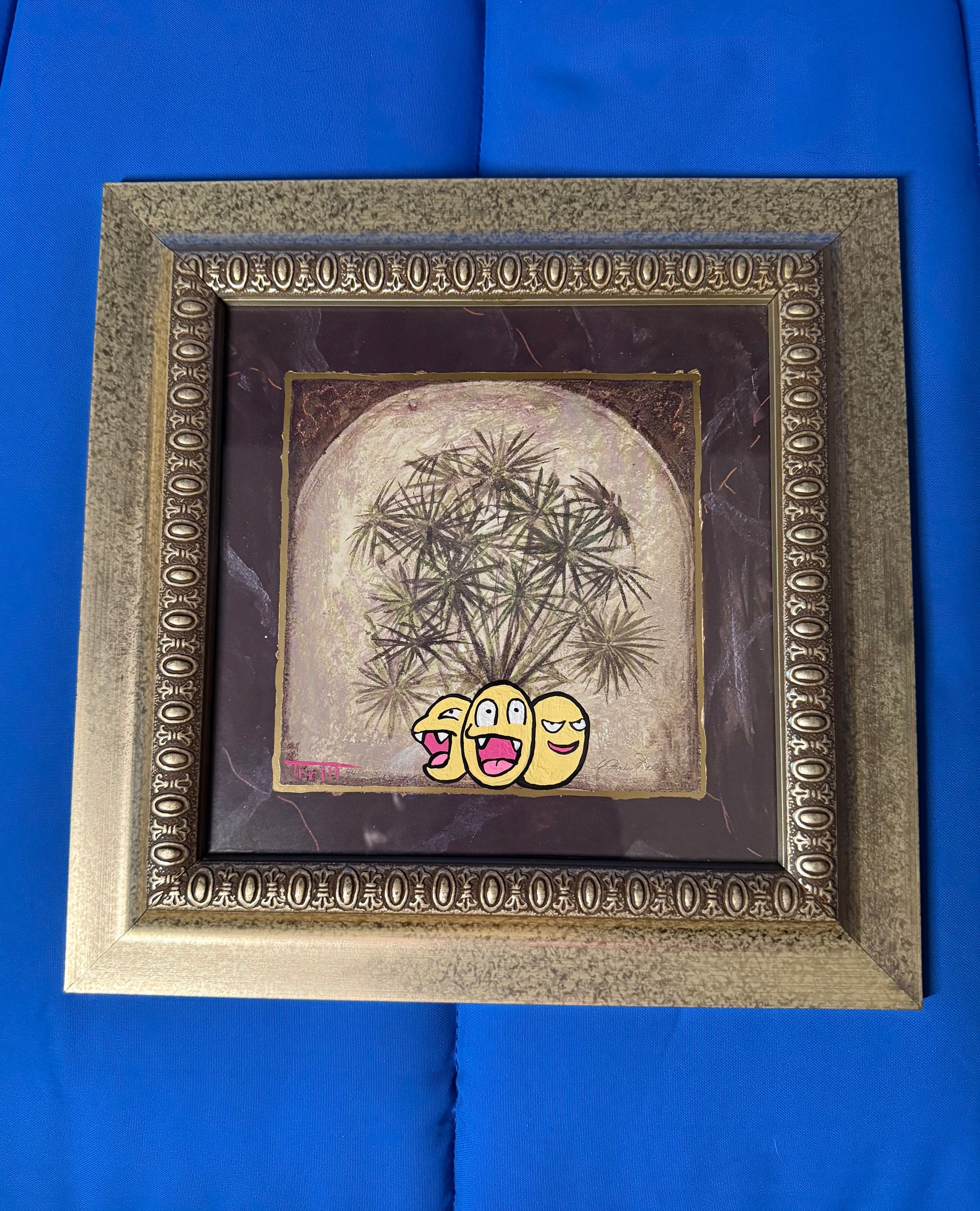 This is a framed print which of a palm plant that has had exeggutor added by hand with acrylic paint. Frame is wood which is painted in gold, also has real glass to protect the art. The print is about 7.5" x 7.5" and the frame measures 11.25" x 11.25" with a hanger on the back to hold onto a screw or nail.