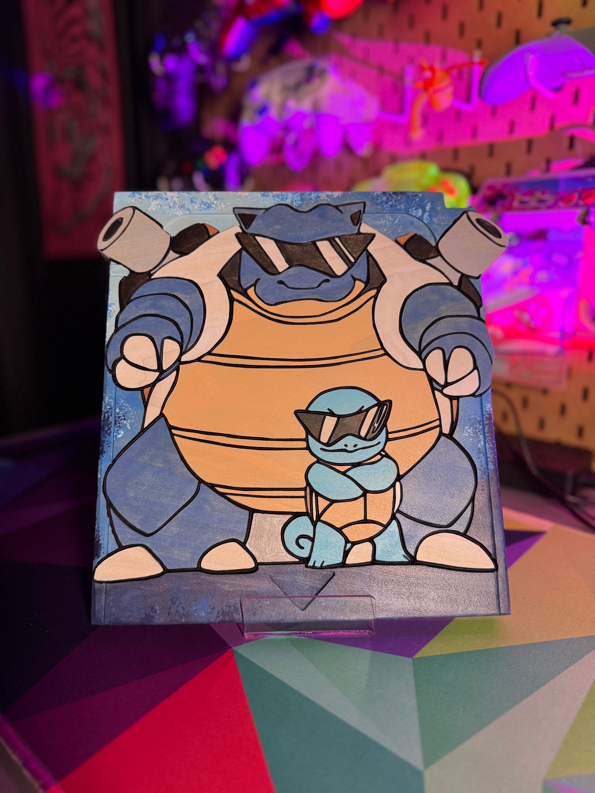 This piece is carved out of a single piece of poplar wood. The pokemon is painted with watercolor, the cartridge with acrylic. The back is painted black and has an eyelet carved in for simple wall hanging. It is sealed with water based matte finish polyurethane.